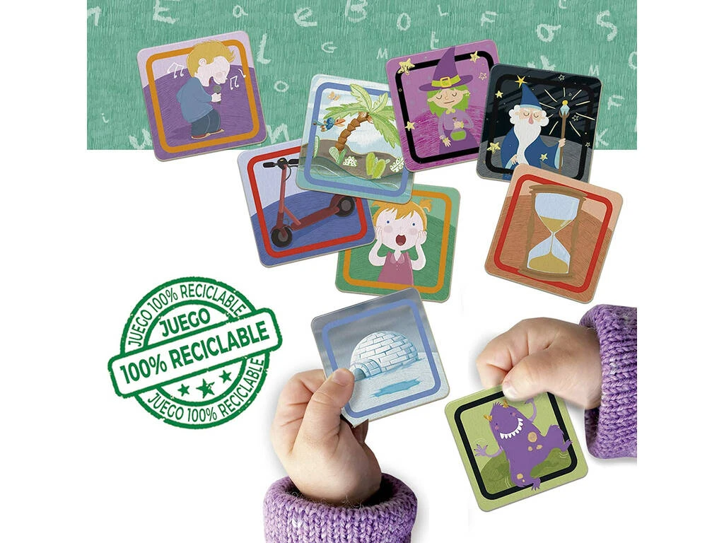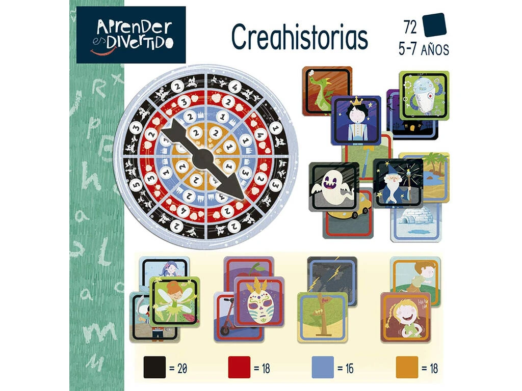 Consigue este divertido juego de mesa, fabricado en materiales 100% reciclables y con el que los peques podrán aprender a desarrollar su imaginación, podrán adquirir habilidades sociales y mejorar su fluidez verbal. Los peques han de utilizar la ruleta para que les marque la combinación de cartas de personajes, escenarios y acciones, con ello han de crear una historia única y genial. ¡Encuentra más juegos educativos con los que acompañar el desarrollo educativo! ¡Hazte con la colección de juegos Aprender Es Divertido de Educa!