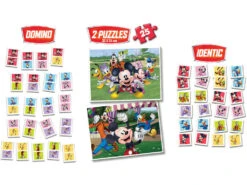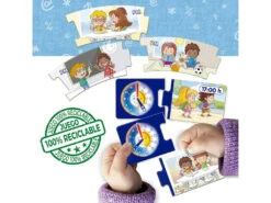 El juego incluye hasta 8 láminas con temas como: En la escuela, el cuerpo humano, ¿Qué hora es?, formas y dimensiones, sumas y restas, los contrarios, los animales y el abecedario.
