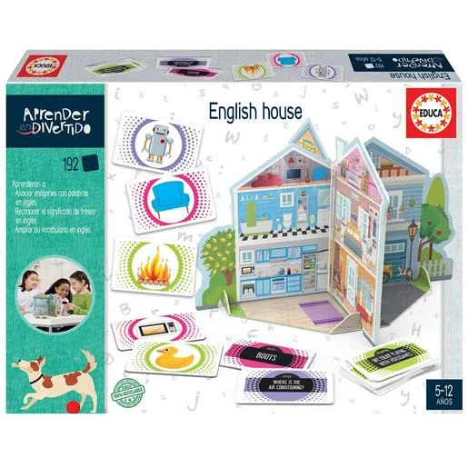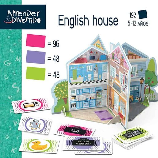Incluye 1 casa de cartón en 3D, cinta adhesiva, 192 tarjetas con palabras y frases en inglés e instrucciones.