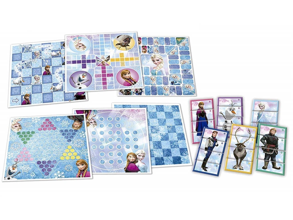 Incluye: 1 caja de almacenaje, 1 parchís, 1 tablero de damas, 6 puzzles de 4 piezas cada uno y muchos juegos de mesa clásicos con temática Frozen más.
