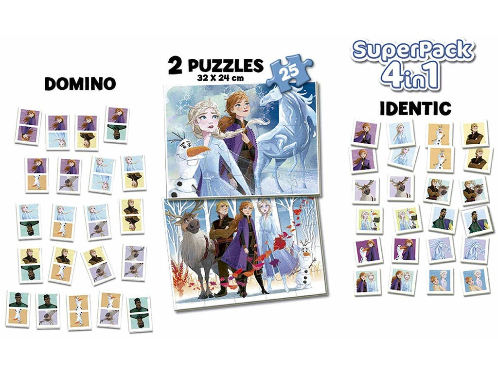 Incluye: 1 dominó con imágenes de Frozen 2 (21 fichas), 1 juego Identic con imágenes de Frozen 2 (24 fichas) y 2 puzzles de Frozen 2 (25 piezas cada puzzle).