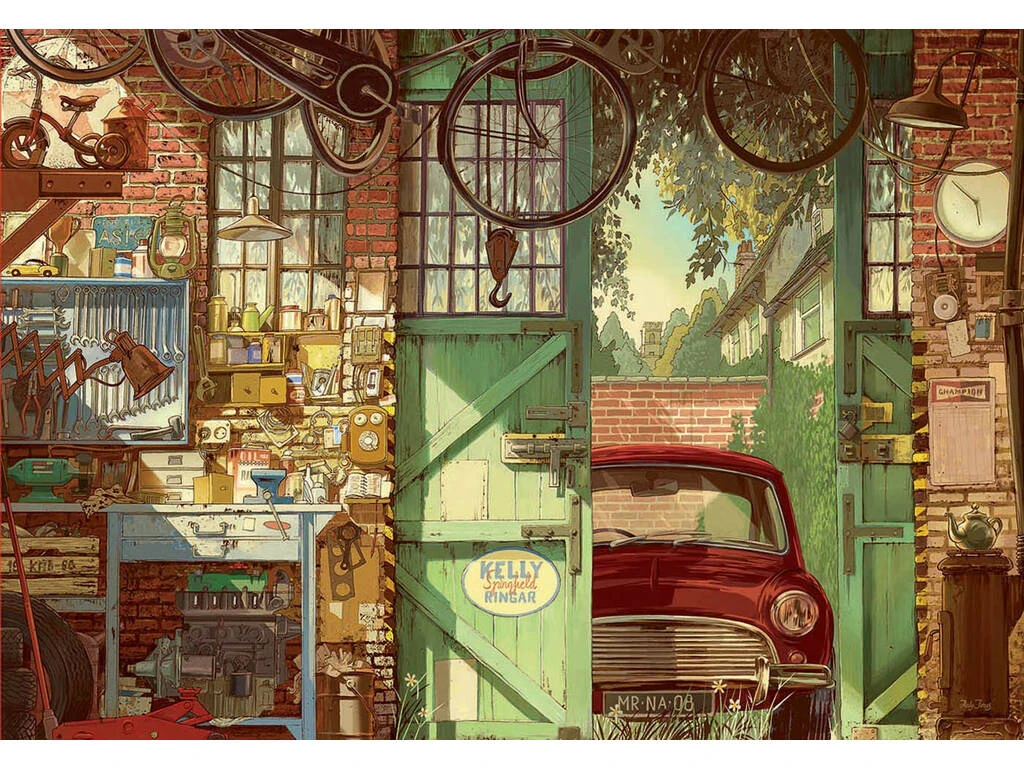 Descubre un nuevo reto en el que has de recrear el famoso garaje de Arly Jones, un puzzle de más de mil piezas con el que disfrutar de horas del entretenimiento más útil y reconfortante. Al finalizar el puzzle tendrás una genial imagen a todo color, en la que se puede ver un vehículo clásico, bicicletas colgadas del techo y un sin fin de herramientas.