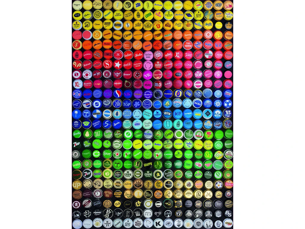 Hazte con este nuevo reto de mil piezas que incluye una imagen muy especial, donde se muestran chapas de diferentes colores y estilos, que juntas forman un collage multicolor sobre un fondo negro. Une todas las piezas hasta reunir las chapas de forma ordenada, identifica los diferentes tipos de bebidas con el logo de cada una de las chapas.