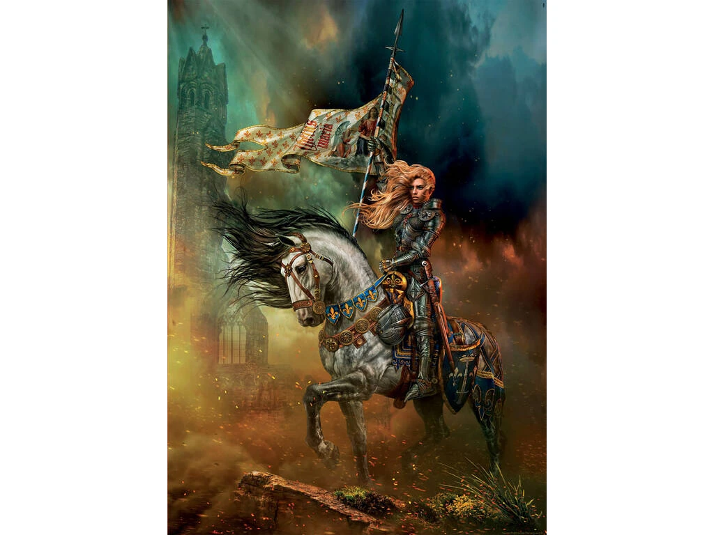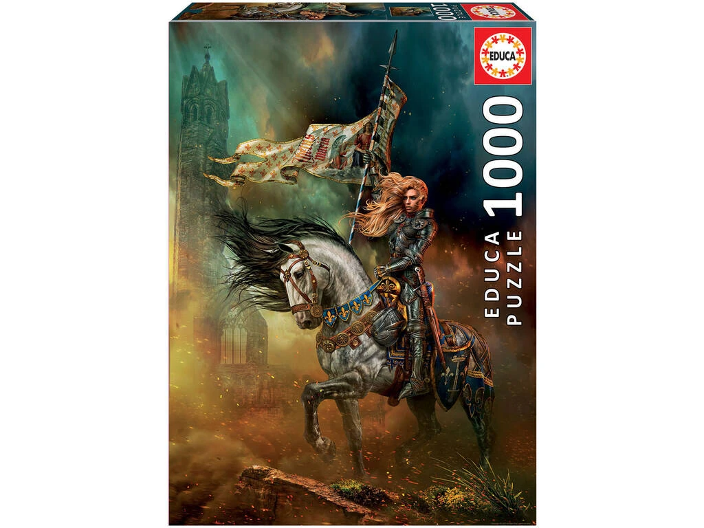 ¡Sentada en su caballo, crea el Puzzle 1000 Juana De Arco Educa 19260 y siente el poder que transmite la imagen!